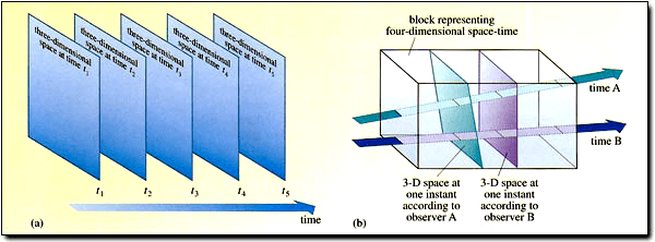 Figure 25: (a) The pre-Einsteinian view of space and time. Not only are space and time separate and distinct, they are also absolute. All observers agree on what constitutes space and what constitutes time, and they also agree about what it means to speak of ‘the whole of space at a particular time’. (b)The post-Einsteinian view in which space and time are seen as aspects of a unified space-time. Different observers in uniform, relative motion will each slice space time into space and time, but they will do so in different ways. Each observer knows what it means to speak of ‘the whole of space at a particular time’, but different observers no longer necessarily agree about what constitutes space and what constitutes time.